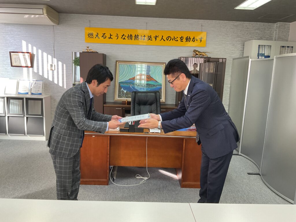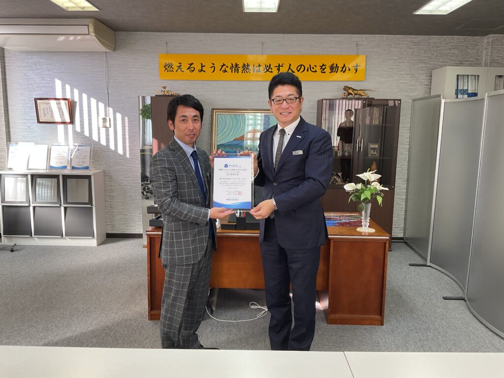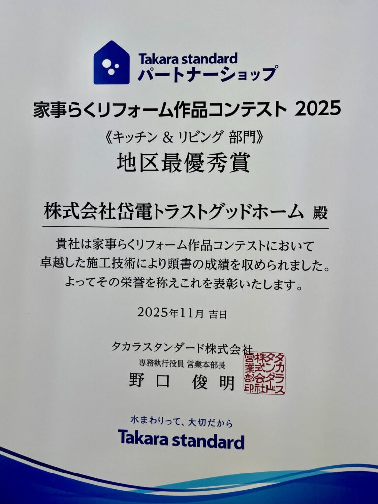 令和7年12月9日、タカラスタンダード株式会社の林福岡支社長様・熊本営業所の長谷川所長様・弊社営業担当の德田様の3名が来社され、賞状を頂きました。
