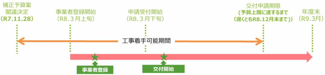 ※ 補正予算案閣議決定日(令和7年11月28日)以降に対象工事(断熱窓への改修を含むリフォーム工事全体をいう)に着手したものを対象とする(下図参照)。なお、窓の改修と同一契約内でドア