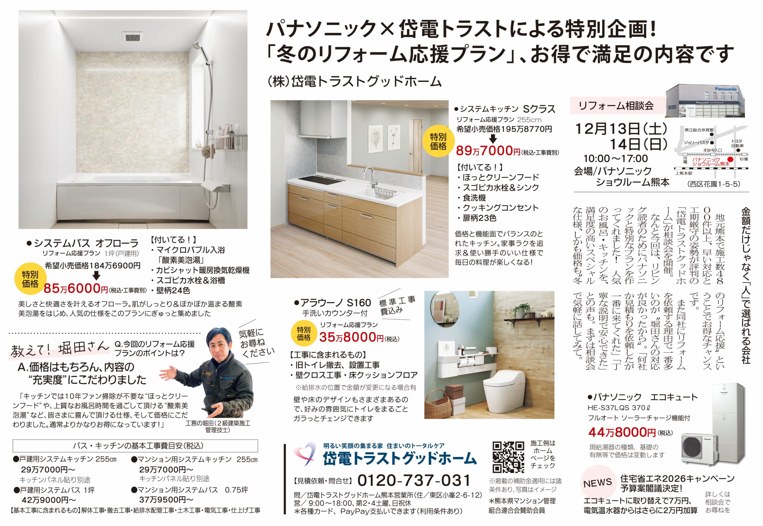 商品や工事内容、工事期間等についてお聞きになられたい方は、12月13日(土)・14日(日)、上熊本にありますパナソニックショウルーム熊本へ是非ご来場ください!
