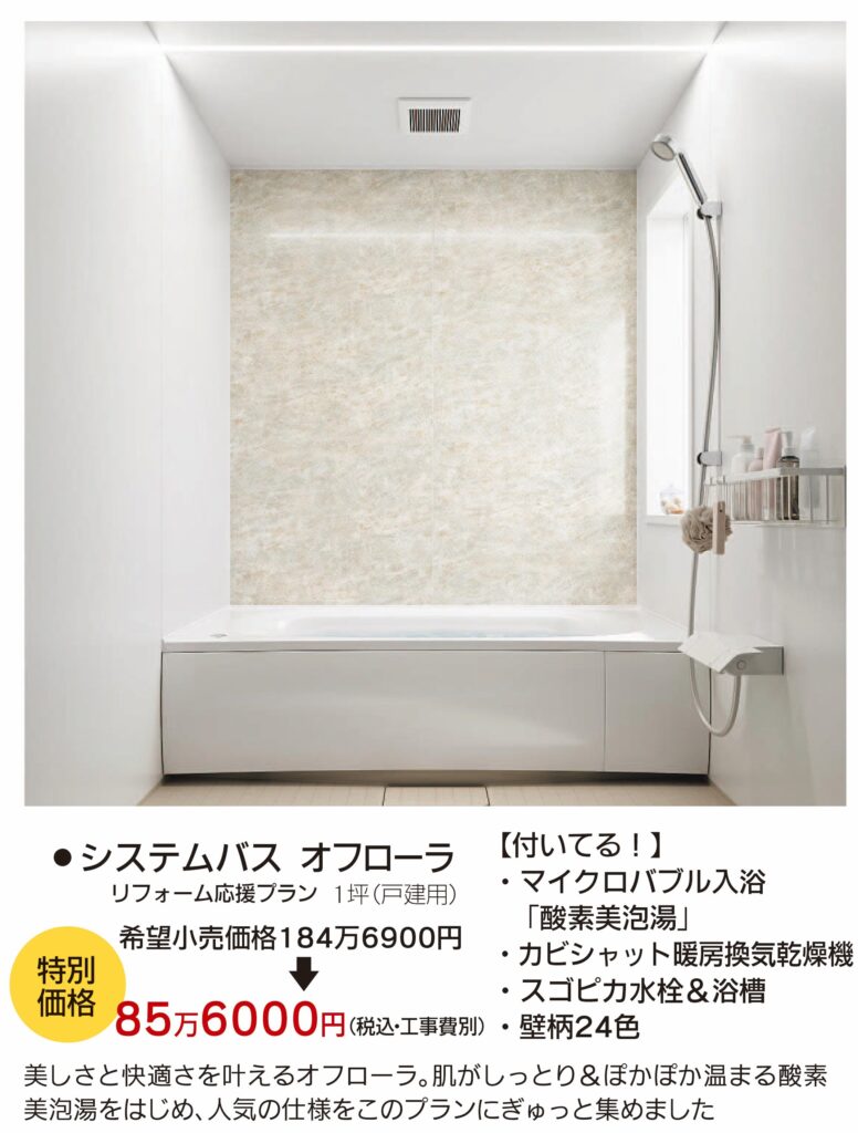 「酸素美泡湯」も「カビシャット暖房換気乾燥機」も付いている、ワンランクアップのシステムバス必見です!!