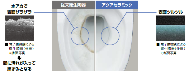 落ちるンです。100年クリーン『アクアセラミック』。キズがつきにくく、ISOに準拠した抗菌(銀イオン)パワーで細菌の繁殖も抑えます。