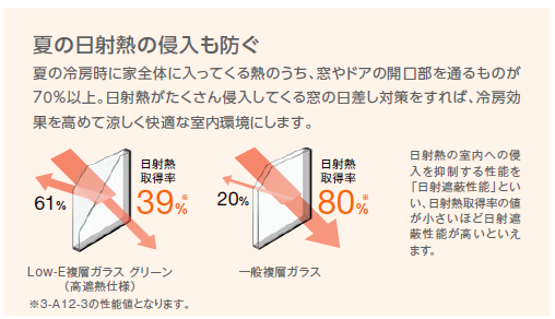 紫外線は、人体や住まいにとって有害な電磁波です。肌の日焼けやカーテン・家具などの色褪せの原因にもなります。『LOW-E複層ガラス』は、一般複層ガラスに比べ、より多くの紫外線をカットするため紫外線対策にもおすすめです。