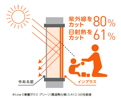 家の中で熱の出入りが大きいのが窓です。窓の断熱性がアップすると、住まい全体の断熱性もアップ。毎月の暖冷房費が約1,880円節約でき、インプラスがお財布にもうれしい効果をもたらします。
