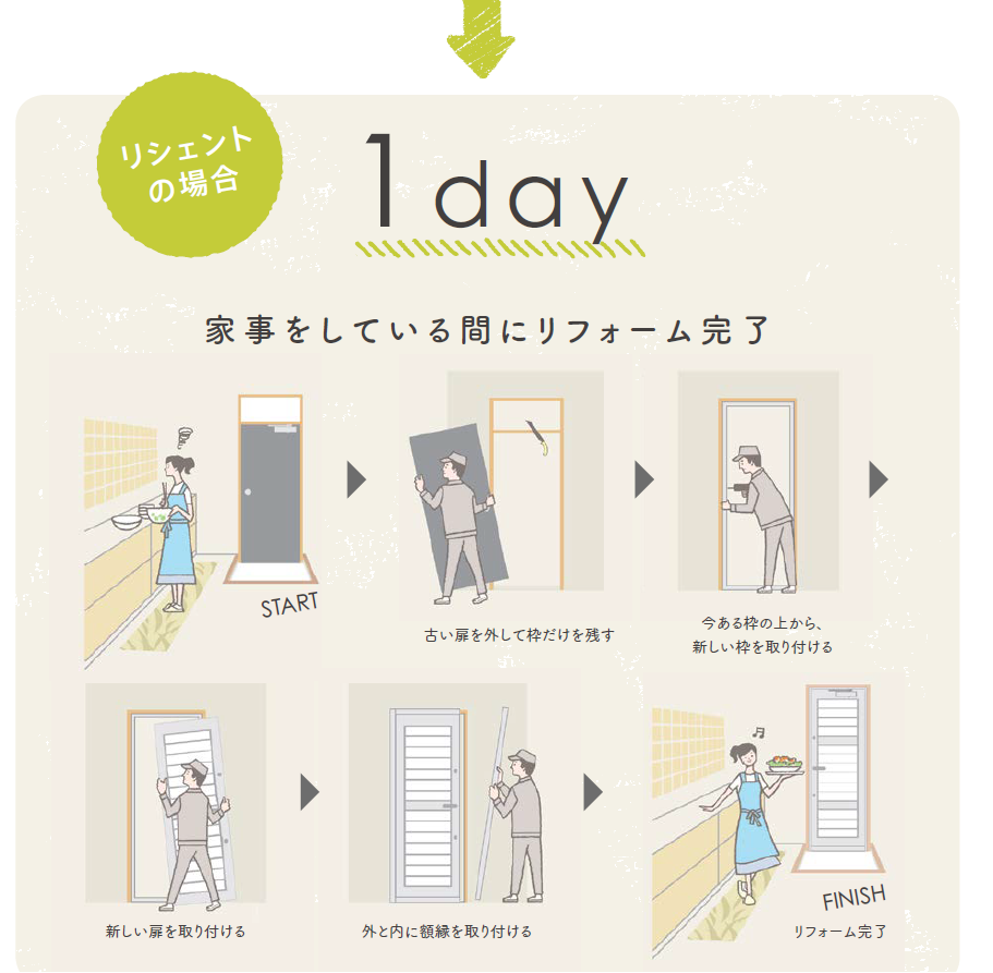 玄関ドアと勝手口どちらもカバー工法なので壁を壊さず、どちらも1日で取替えできます!(^^)!