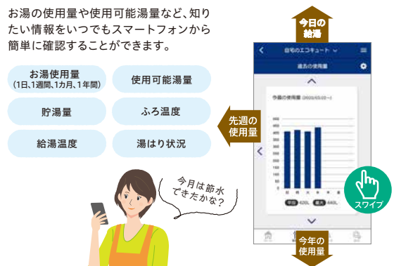 お湯の使用量や使用可能湯量など、知りたい情報をいつでもスマートフォンから簡単に確認することができます。