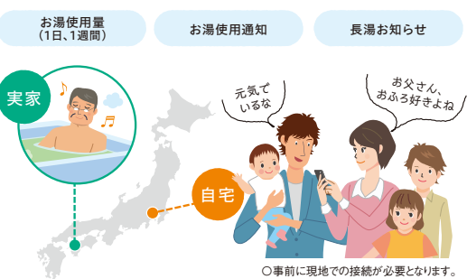 遠隔地にあるエコキュートの使用状況をアプリでチェックできます。前日にお湯が使われていないことや、入浴時間が長いことが確認できるので、離れて暮らすご家族の生活を見守れます。