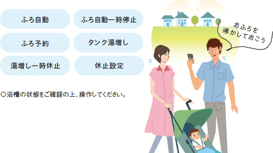 家に帰ってすぐにお風呂に入りたい時や、急な来客でお湯がたくさん必要になった時など、外出先からでも操作できるので大変便利です。もちろん家の中からの操作もラクラクです。