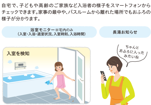 自宅で、子どもや高齢のご家族など入浴者の様子をスマートフォンからチェックできます。家事の最中や、バスルームから離れた場所でもおふろの様子が分かります。