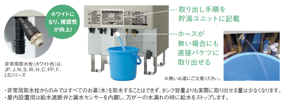 非常用取水栓標準装備。タンク内の湯水を生活用水として使えます。