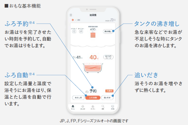 ふろ自動・追いだき・ふろ予約・タンクの沸き増しなどがアプリでカンタンに操作できます。