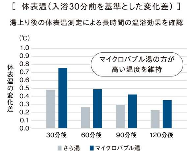 肌の毛穴よりはるかに小さいマイクロバブルとそれよりもさらに小さいウルトラファインバブルの特別な2種類の泡が、肌を優しく包み込みじんわりあたためてくれます。まるで温泉のように白濁したシルキーなお湯に包まれて入浴タイムを至福の時にしてくれます。