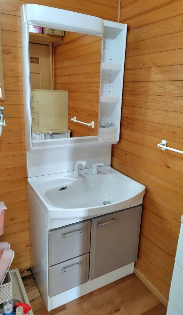 木製の洗面台は今回のように水漏れするとすぐに傷んでしまうので、丈夫できれいが永く続くホーロー製のタカラスタンダードの洗面化粧台にリフォームされました!