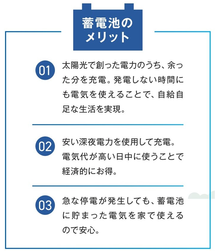 そして、近年増加傾向にある災害への備えで「蓄電」で家族を守るのです。もしもの時も快適に!誠実対応の岱電トラストグッドホームにおまかせください。停電時などに電気を使える「喜び」と「安心」がある生活をご提案します。