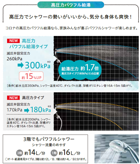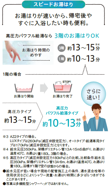 給湯圧力がアップ、260kpa!高圧力でシャワーの勢いが良く、お湯張りも早いから帰宅後やすぐに入浴したいときも便利です。1階設置のお風呂なら、10分から13分程で湯張りできます!