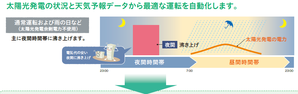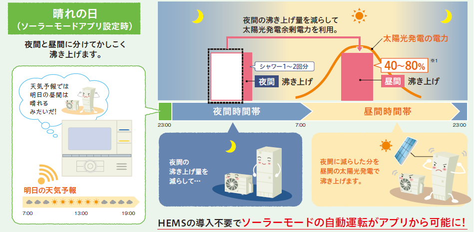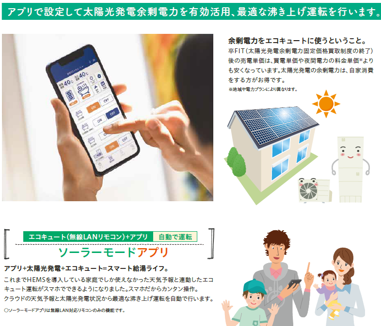 また太陽光発電システム設置されている場合、ソーラーアプリモードで天気予報データを入手してより効率的にお湯を沸かしてくれます。特に、売電期間10年間が終了した方は深夜電力で沸き上げするより昼間の余剰電力を利用した方が経済的になることあるのでお勧めです!
