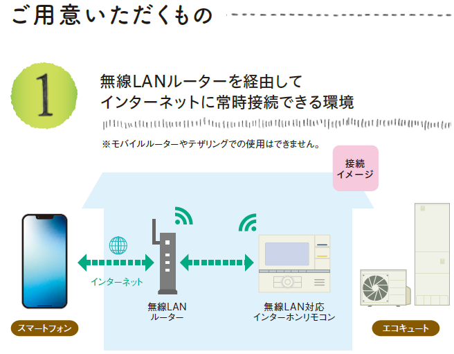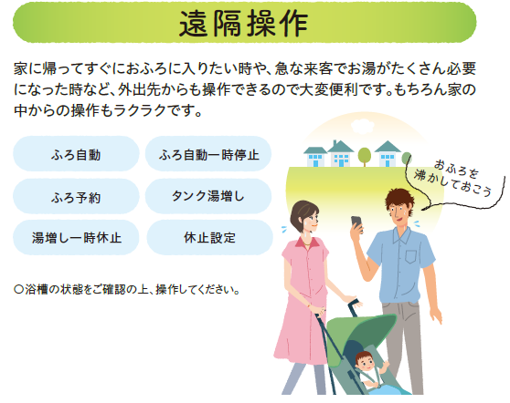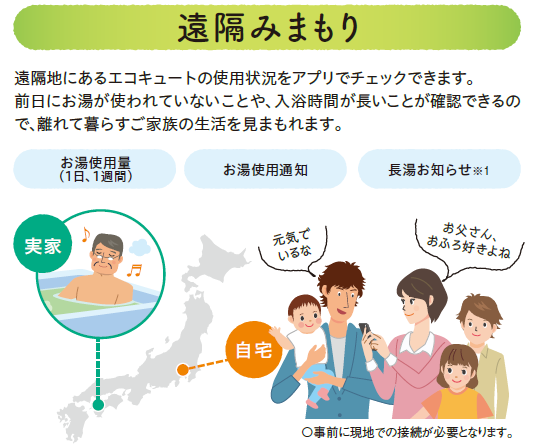 無線LAN対応リモコンで携帯などから遠隔操作でお湯張りはもちろん、離れて暮らすご家族の生活を見守れます。